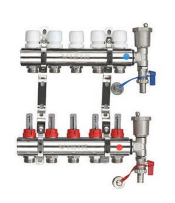Коллекторная группа ЛАТУНЬ с расходомером 1" х 5 выход. БЕЗ КРАНОВ (5шт)