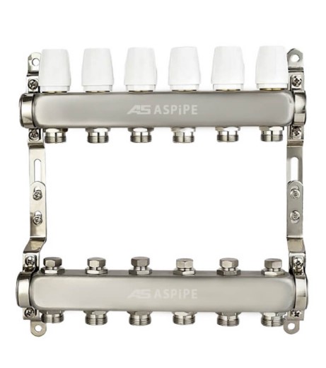 Коллекторная группа из нержавеющей стали ASPIPE с размером подключения 1 дюйм и 7 выходами. Оснащена без коллекторных тройников, что обеспечивает надежное и герметичное подключение для систем отопления и водоснабжения. Идеально подходит для распределения воды с возможностью самостоятельного монтажа тройников по необходимости.